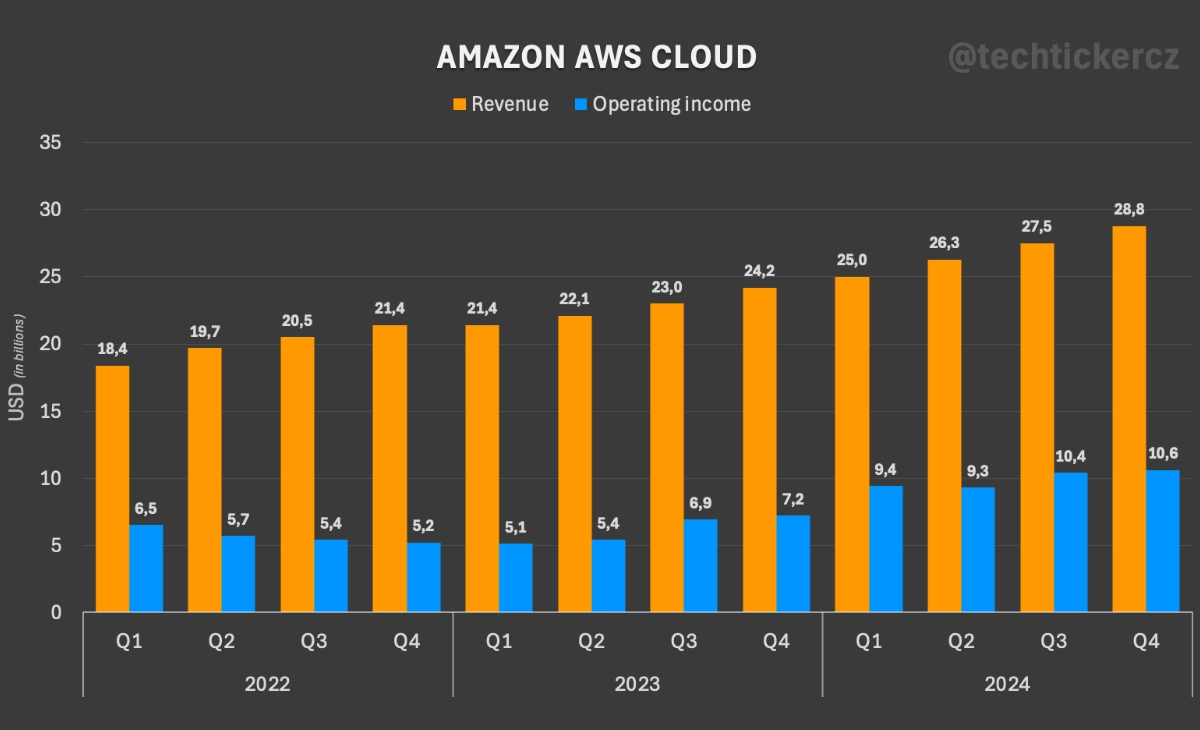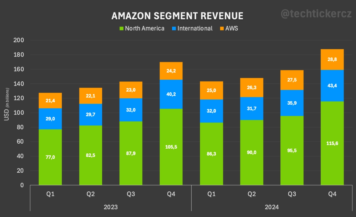Cloud AWS (Amazon Web Services) potvrdil svou pozici hlavního zdroje zisků. Tržby AWS meziročně vzrostly o 19 % na 28,8 miliard dolarů, provozní zisk zaznamenal meziroční růst o 48 % na 10,6 miliard dolarů a provozní marže dosáhla působivých 36,9 %.