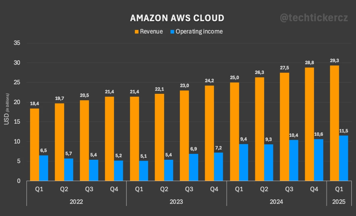 AWS zůstává nejvýnosnějším segmentem společnosti, generující většinu provozního zisku, přestože představuje nejmenší podíl na celkových tržbách.