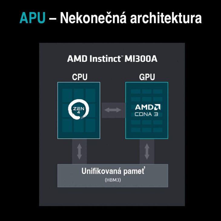 Dále byl představen procesor APU (Accelerated Processing Unit) Instinct MI300A, který je určený pro datová centra. APU jednotky kombinují procesory (CPU) a grafické procesory (GPU) pro dosažení rychlejšího zpracování dat.