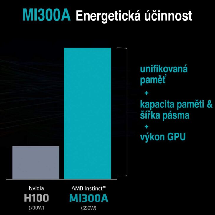 Čip MI300A nabízí vyšší výkon, rychlejší modelování a třicetinásobné zvýšení energetické účinnosti. Ve srovnání s konkurenční Nvidia H100 má MI300A o 1,6 krát větší kapacitu paměti a disponuje unifikovanou (jednotnou) pamětí – to znamená, že MI300A nemusí data přenášet z operační paměti do akcelerátoru, díky tomu je rychlejší než Nvidia H100.