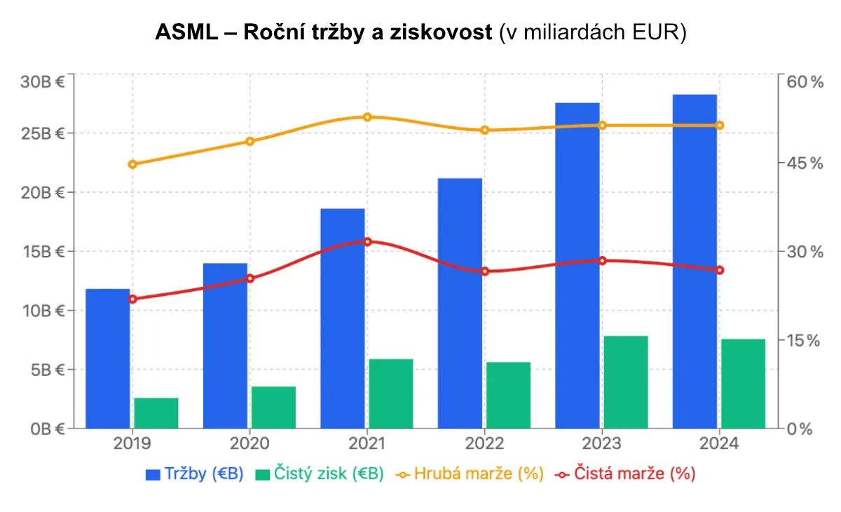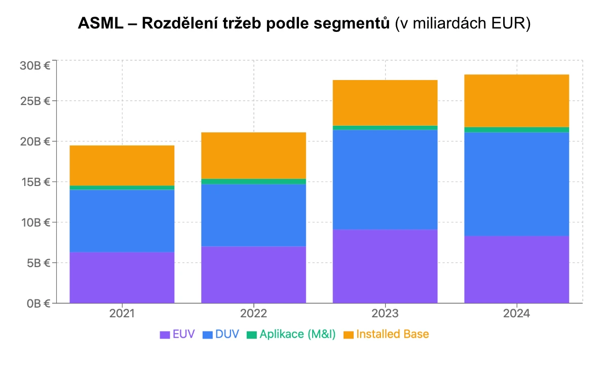 ASML využívá vysoce profitabilní obchodní model, kde 73 % tržeb (20,6 miliard EUR v roce 2024) pochází z jednorázového prodeje litografických systémů a 27 % (7,7 miliard EUR) z opakujících se servisních příjmů.