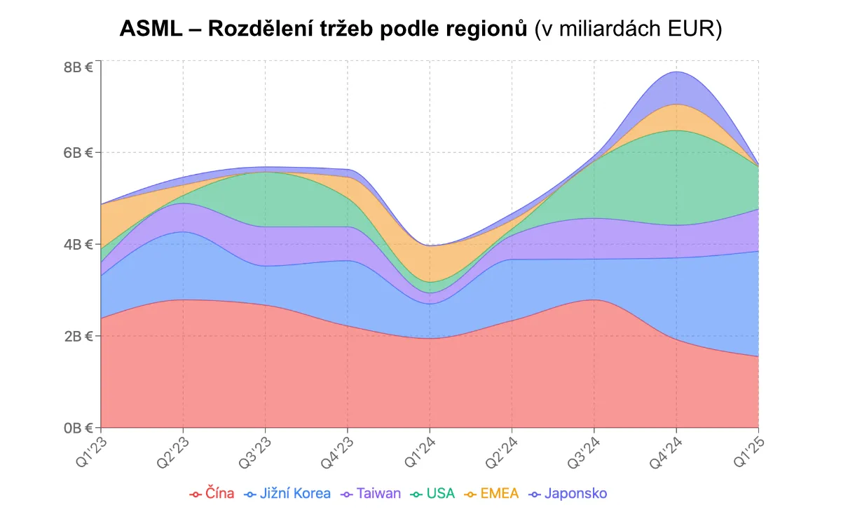 Čína představuje pro ASML největší geopolitické riziko s dramatickým dopadem na finanční výsledky – z rekordního podílu 49 % celkových tržeb v Q1 2024 společnost očekává pokles na dlouhodobě udržitelných 20 %, což představuje ztrátu na tržbách v rozmezí 8–10 miliard EUR ročně.