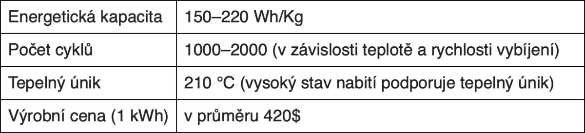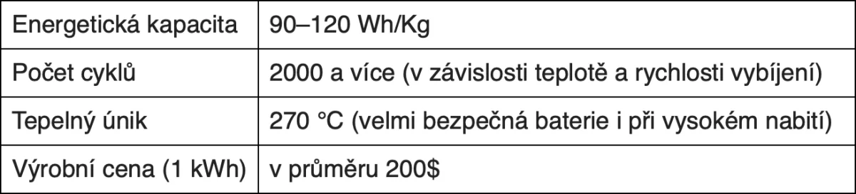 LFP baterie se vyznačují vysokou stabilitou, ale nižší energetickou hustotu než mají například NMC baterie. Materiály použité k výrobě katody (železo a fosfát) jsou dostupnější a levnější než materiály použité k výrobě katody u NMC baterií. Kromě nižších nákladů má železo a fosfát i další výhody – jsou méně toxické a lépe recyklovatelné.