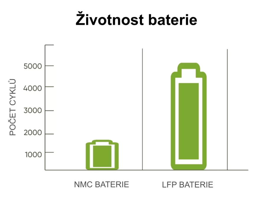 LFP baterie disponují vyšším počtem nabíjecích cyklů, což jim zajišťuje delší životnost. Obecně se uvádí, že lithium-železo-fosfátové baterie vydrží více než 6000 cyklů, zatímco životnost nikl-mangan-kobalt baterií je obvykle 800–1000 cyklů.