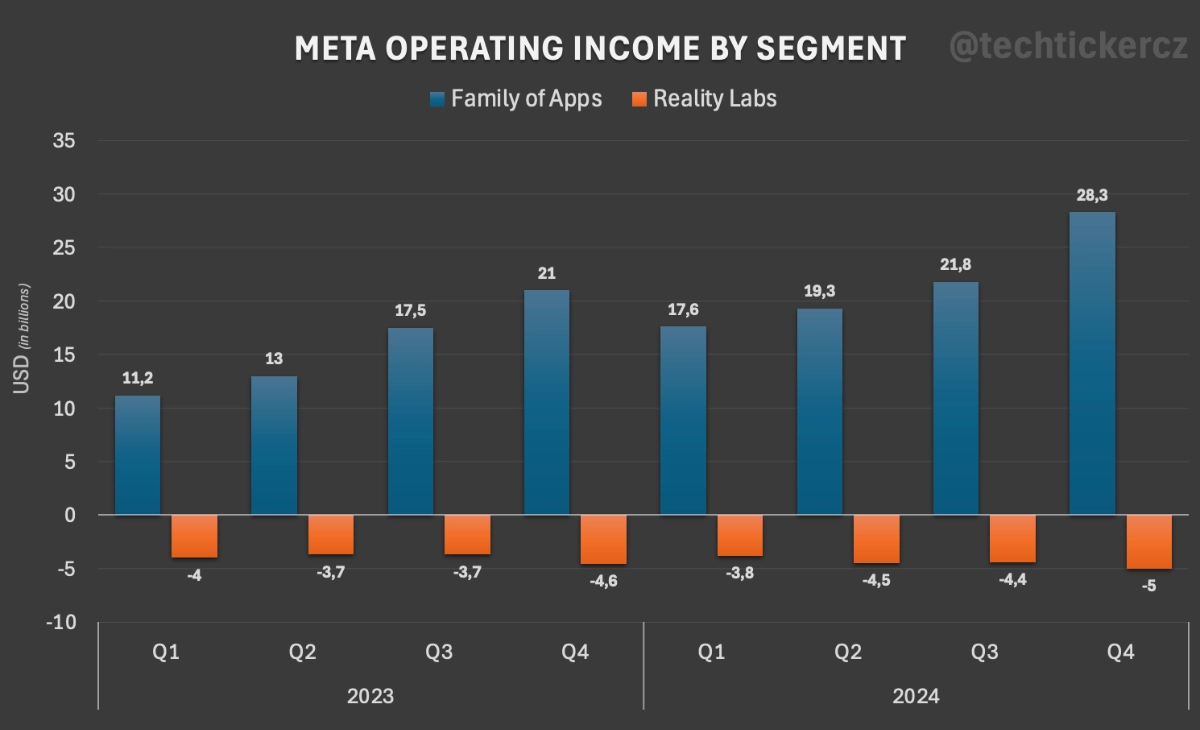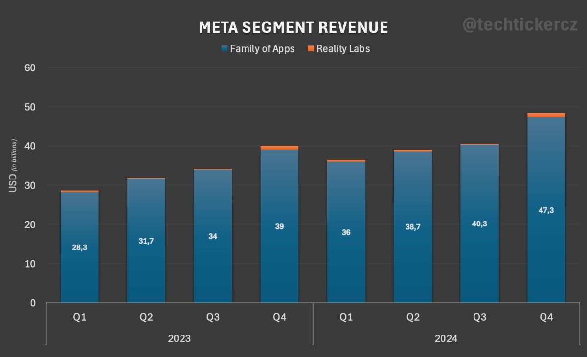 Hlavním tahounem růstu byl segment Family of Apps, zahrnující platformy Facebook, Instagram, WhatsApp a Messenger, který vygeneroval tržby 47,3 miliard dolarů. Divize Reality Labs, zaměřená na virtuální a rozšířenou realitu, přispěla tržbami 1,1 miliardy dolarů, ale nadále vykazuje provozní ztrátu 5 miliard dolarů.