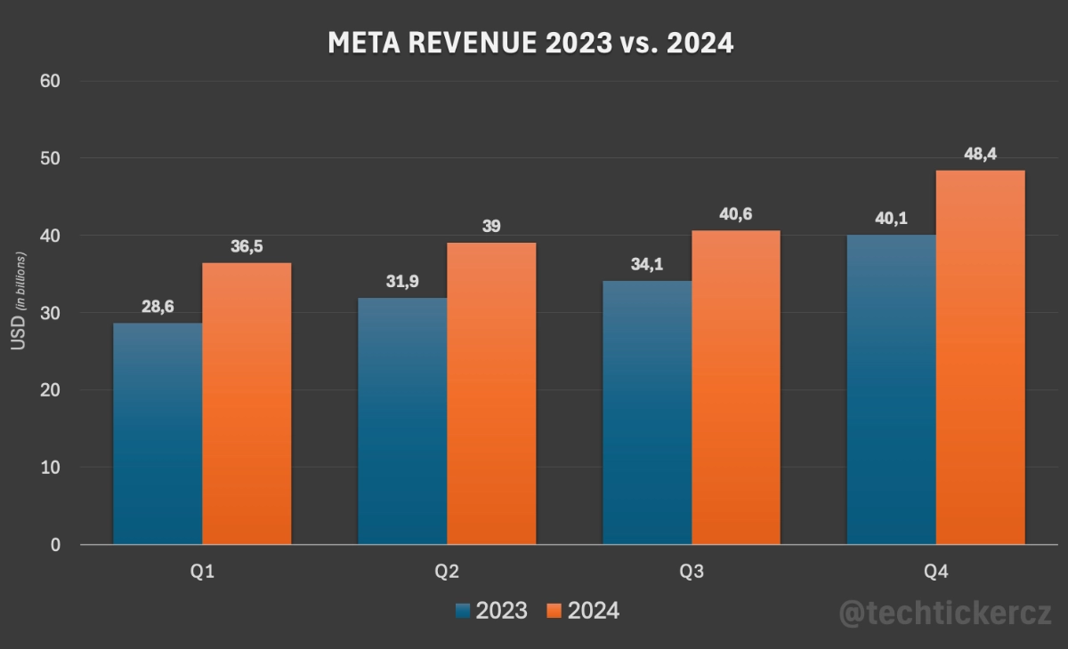 Meta Platforms představila mimořádně silné finanční výsledky za 4. čtvrtletí roku 2024. Společnost dosáhla rekordních tržeb ve výši 48,4 miliard dolarů a čistého zisku 20,8 miliard dolarů, což představuje výrazný meziroční nárůst.