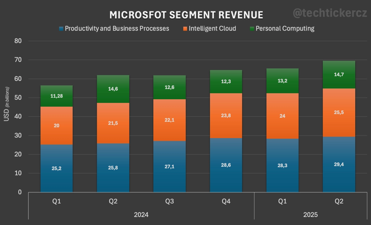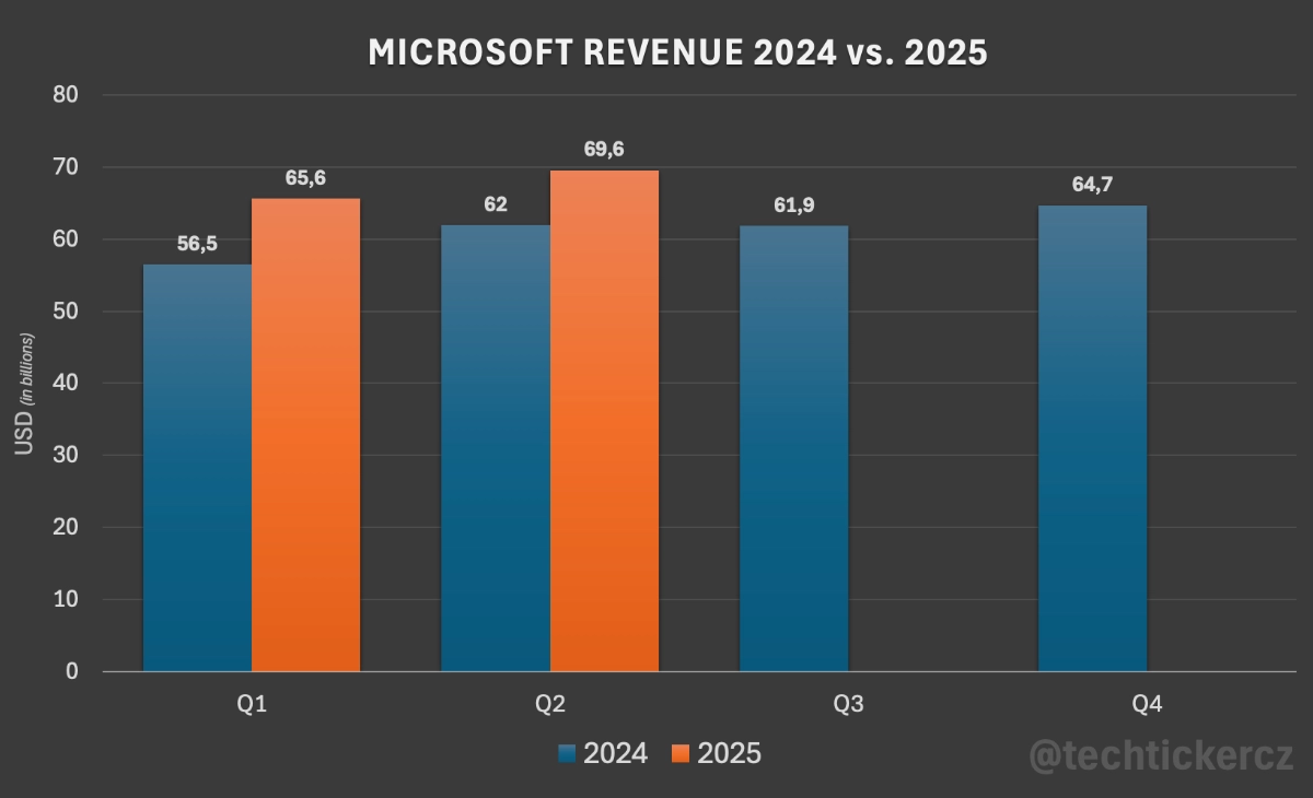 Technologický gigant vykázal celkové příjmy ve výši 69,6 miliard dolarů, což představuje meziroční nárůst o 12 %. Provozní zisk vzrostl o výrazných 17 % na 31,7 miliard dolarů, zatímco čistý zisk roste o 10 % na 24,1 miliard dolarů. Hrubá marže mírně poklesla na 69 % kvůli investicím do AI infrastruktury.