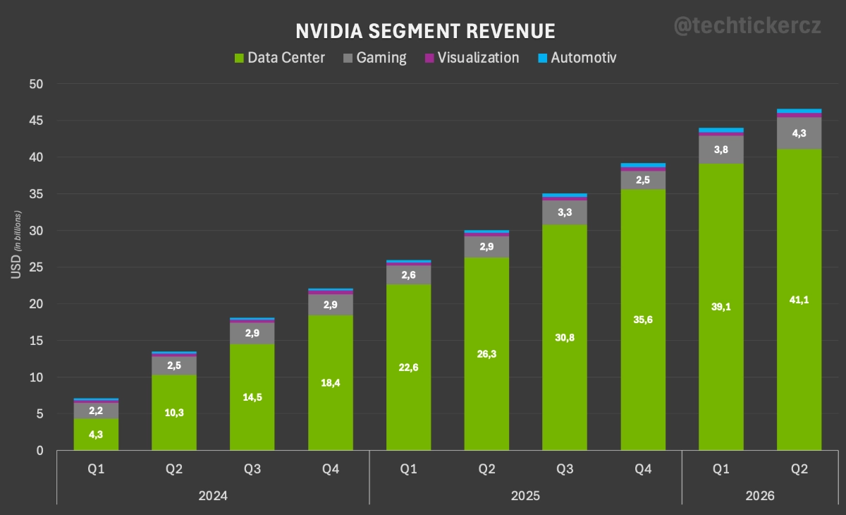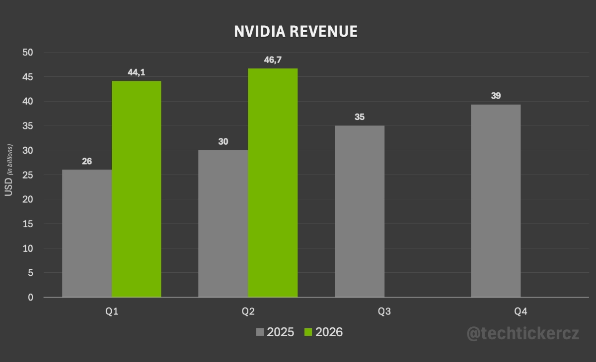 Nvidia zveřejnila finanční výsledky za druhé čtvrtletí fiskálního roku 2026. Společnost zaznamenala rekordní tržby ve výši 46,7 miliard dolarů, což představuje mezičtvrtletní růst o 6 % a impozantní meziroční růst o 56 %.