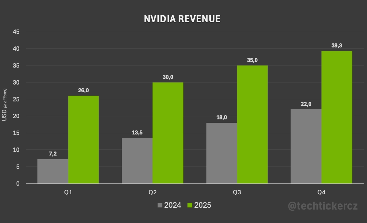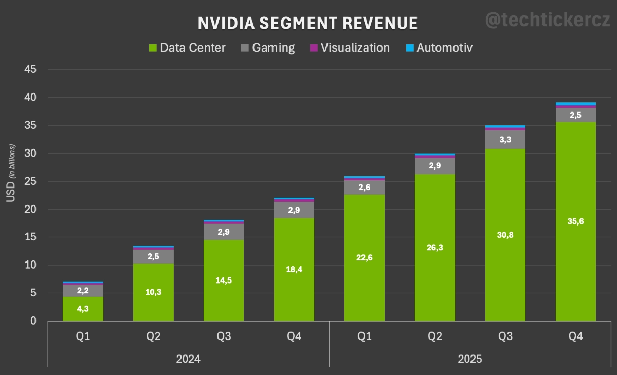 - Tržby z datových center: 35,6 miliardy dolarů, nárůst o 16 % oproti předchozímu čtvrtletí a o 93 % meziročně