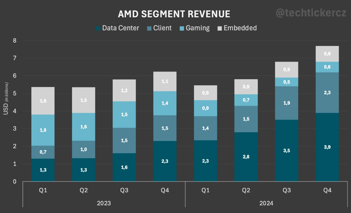 Segment datových center se stal hlavním tahounem růstu. Tento segment zaznamenal tržby ve výši 3,9 miliardy dolarů, což představuje meziroční nárůst o 69 %. Provozní zisk vzrostl na 1,16 miliardy dolarů při provozní marži 30 %. Tento výrazný růst byl podpořen silnou poptávkou po procesorech EPYC a GPU akcelerátorech Instinct. Avšak ani tento růst nenaplnil očekávání analytiků, kteří očekávali tržby ve výši 4,2 miliardy dolarů.