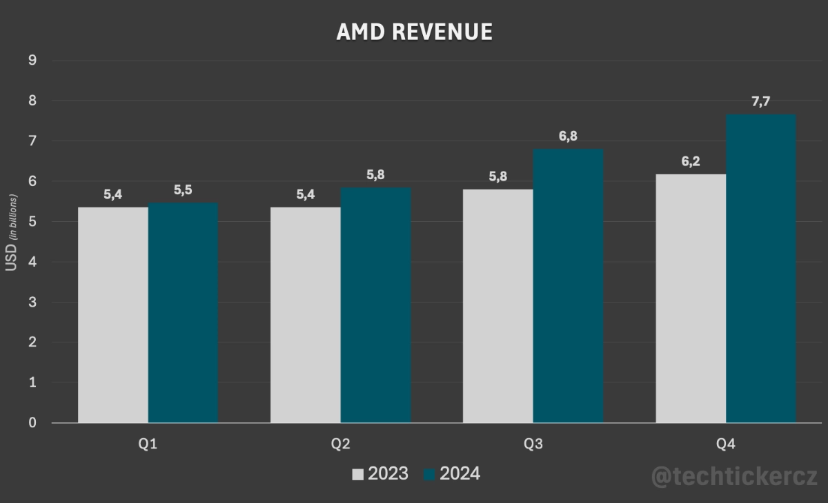 Společnost AMD (Advanced Micro Devices) zakončila rok 2024 a zveřejnila výsledky za 4. čtvrtletí. Společnost dosáhla rekordních tržeb ve výši 7,7 miliardy dolarů, což představuje meziroční nárůst o 24 %. Tento růst byl tažen především poptávkou v segmentu datových center a silnými prodeji procesorů.