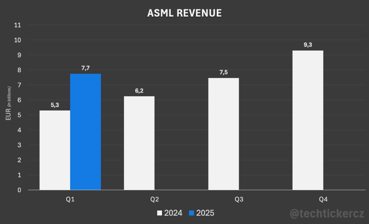 Světový lídr v oblasti výroby pokročilých litografických systémů, ASML, dnes zveřejnil své finanční výsledky za první čtvrtletí roku 2025. Společnost vykázala tržby ve výši 7,7 miliard EUR a čistý zisk 2,4 miliardy EUR.