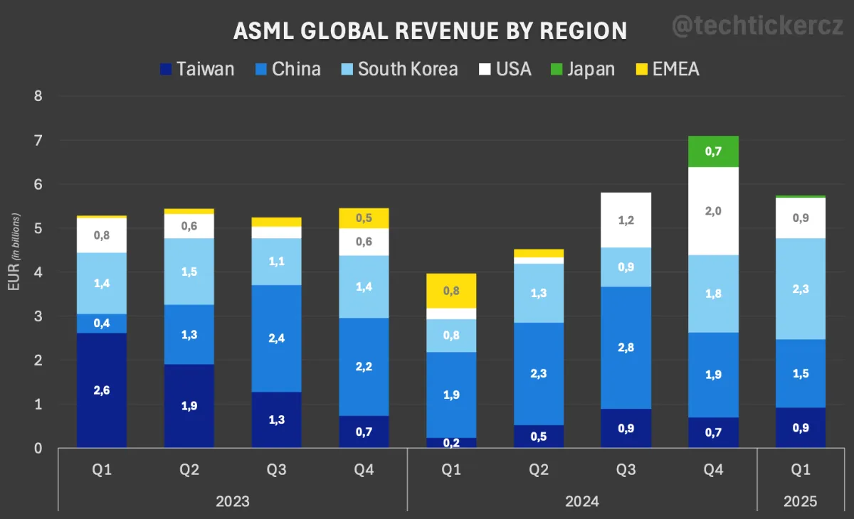Z regionálního pohledu byl v prvním čtvrtletí pro ASML největší trh Jižní Korea s 40% podílem na tržbách, následovaná Čínou s 27% podílem, USA a Tchaj-wanem – obě země s 16% podílem, a nakonec Japonskem s 1% podílem. Tento geografický mix se výrazně změnil oproti čtvrtému čtvrtletí 2024, kdy byla Jižní Korea zastoupena 25 %, USA 28 %, Čína 27 %, Tchaj-wan 10 % a Japonsko 10 %.