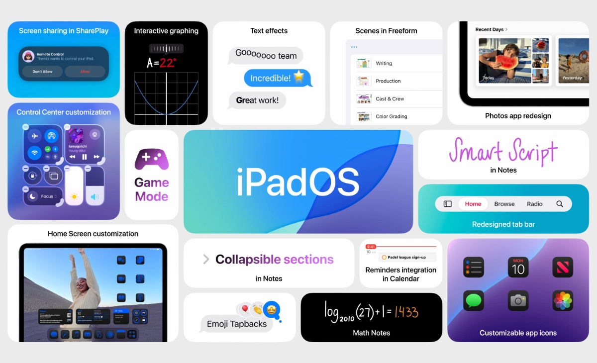 Nový iPadOS 18 nabízí uživatelům stejné možnosti přizpůsobení plochy a uživatelského prostředí včetně vlastního uspořádání ovládacího centra jako iOS 18. Mezi největší novinky určitě patří možnost SharePlay, která vám dovolí sdílet obrazovku s přáteli a rodinou. Funkce po odsouhlasení uživatelem umožní vzdálené ovládání cizího zařízení nebo v omezenějším režimu dovolí pouze sdílení obrazovky s možností kreslit a psát poznámky a tím navádět uživatele na druhé straně. Takto můžete sdílet obrazovku napříč všemi zařízeními Apple (kromě Apple Watch).